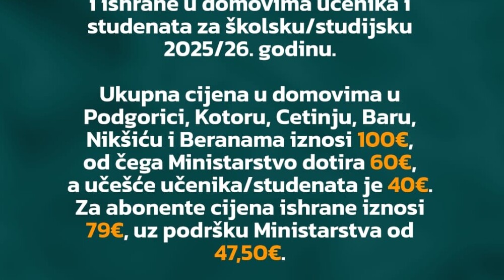 “Cijena ishrane za učenika/studenta abonenta iznosi 79 eura mjesečno, od čega Ministarstvo dotira 47,50 eura, a učešće učenika i studenta abonenta je 31,50 eura. Podsjećamo da cijene ishrane i smještaja u domovima nijesu mijenjane od školske-studijske 2023/24. godine kako bismo pružili podršku našim učenicima i studentima i obezbijedili adekvatnu podršku za učenje i studiranje”, zaključuje se u saopštenju.
