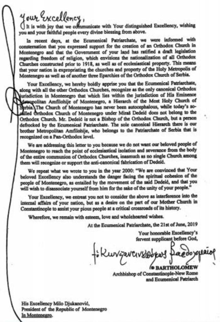 U posljednje vrijeme, u Vaseljenskoj Patrijaršiji, sa zabrinutošću smo obaviješteni da ste izrazili podršku stvaranju Crnogorske pravoslavne crkve, kao i da je Vlada Vaše zemlje ratifikovala nacrt zakona o slobodi vjeroispovijesti, koji predviđa nacionalizaciju svih pravoslavnih crkava sagrađenih prije 1918. godine, kao i crkvene imovine. To znači da Vaša država pristupa eksproprijaciji crkava i imovine Svete Mitropolije crnogorsko-primorske, kao i još tri eparhije Srpske pravoslavne crkve.