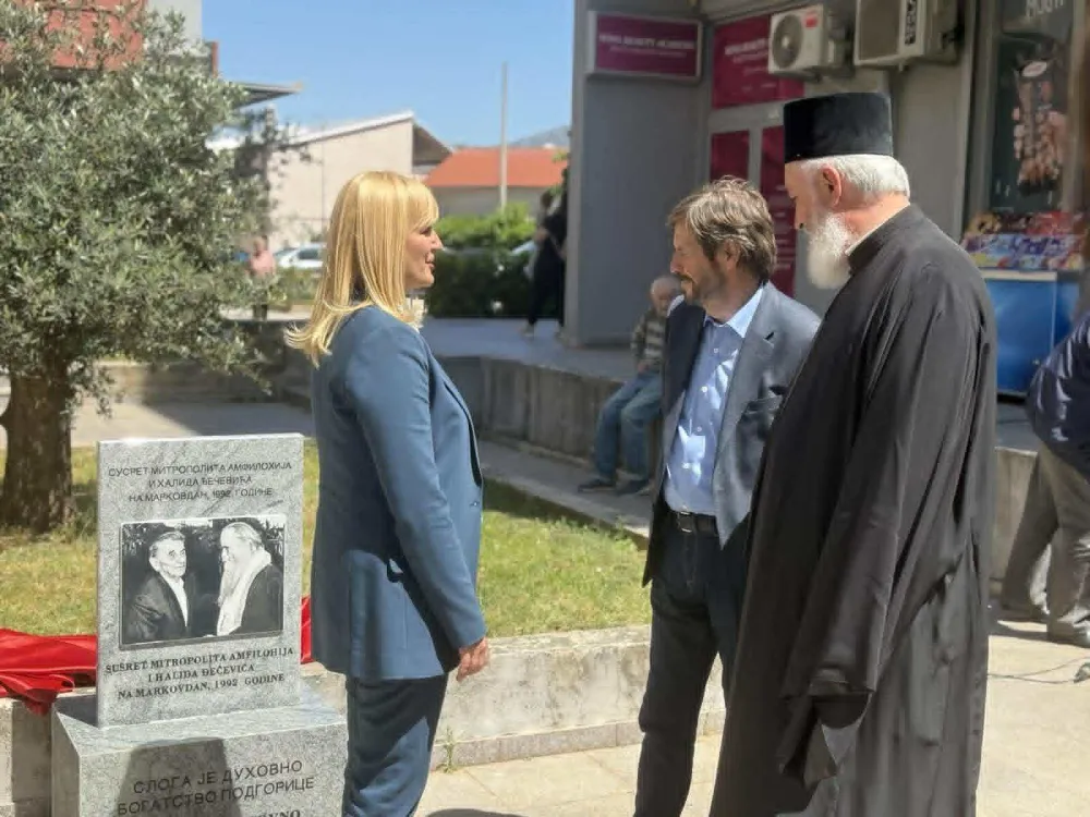 Spomen-ploču, koja čuva sjećanje na susret mitropolita Amfilohija i Halida Đečevića iz 1992. godine, kao snažan simbol zajedništva, razumijevanja i trajnih vrijednosti koje Podgorica njeguje, otkrili su Jelena Borovinić Bojović, predsjednica Skupštine Glavnog grada i Kemal Đečević, predstavnik porodice Đečević.